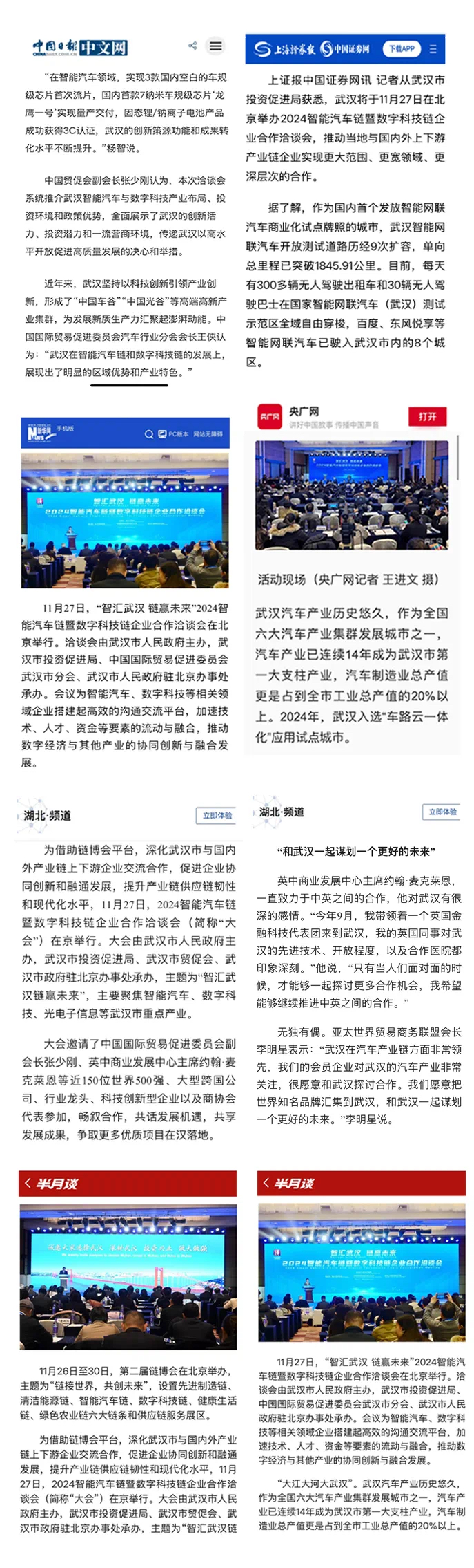 11月27日,第二届链博会期间,由武汉市举办的2024智能汽车链暨数字科技链企业合作洽谈会在京举行。大会聚焦智能汽车、数字科技、光电子信息等武汉市重点产业,旨在深化武汉市与国内外产业链上下游企业交流合作。近150位世界500强、大型跨国公司、行业龙头、科技创新型企业以及商协会代表参加,共话发展机遇,争取更多优质项目在汉落地。