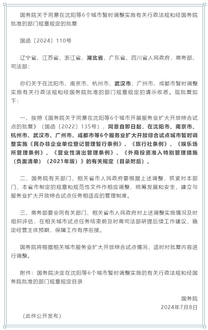 国务院决定在武汉暂时调整实施的