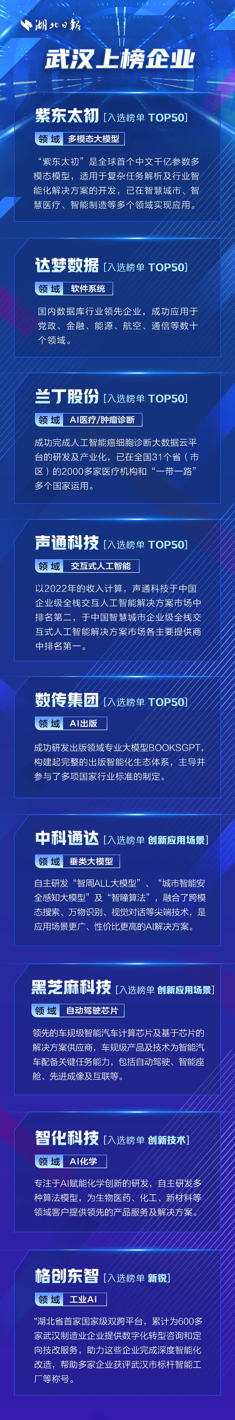 9家福布斯上榜企业中,8家位于光谷。目前,光谷在建垂直行业模型近20个,传神语联“任度”、理工数传“BooksGPT”、莱博信息“科研加”等3个模型获国家网信办备案,光谷已初步实现从芯片到算力、从大模型到应用的全产业链条。