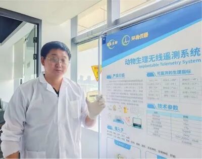 环岛生物科技(武汉)有限公司总经理李敏展示植入式无线微型生理信号采集器。