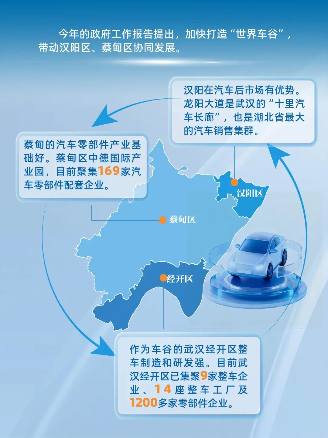 为何是这三地协同?简单概括就是,三地的产业有互补性——武汉经开区整车制造和研发强,蔡甸的汽车零部件产业基础好,而汉阳在汽车后市场有优势。