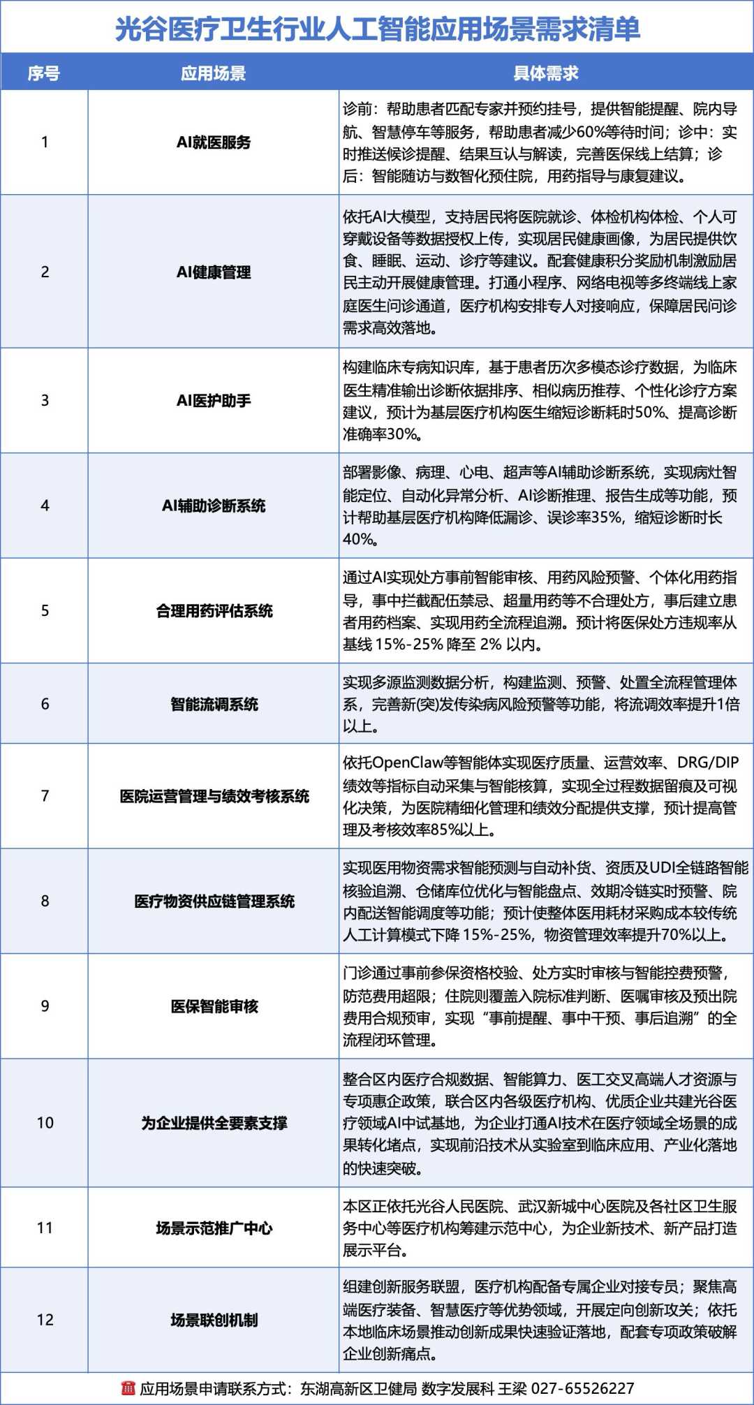 即光谷医疗卫生行业人工智能应用场景需求清单。清单涵盖AI就医服务、AI健康管理、AI医护助手、AI辅助诊断系统、合理用药评估系统等12个具体场景。相关负责人介绍,一些光谷企业开发的医疗AI产品缺乏真实试验场所,光谷已建成投用7家三甲医院,是医疗AI产品的真实“试验场”。政府联合医疗机构主动搜集并发布这些场景需求清单,企业可根据产品特点申请场景,加速技术落地应用。