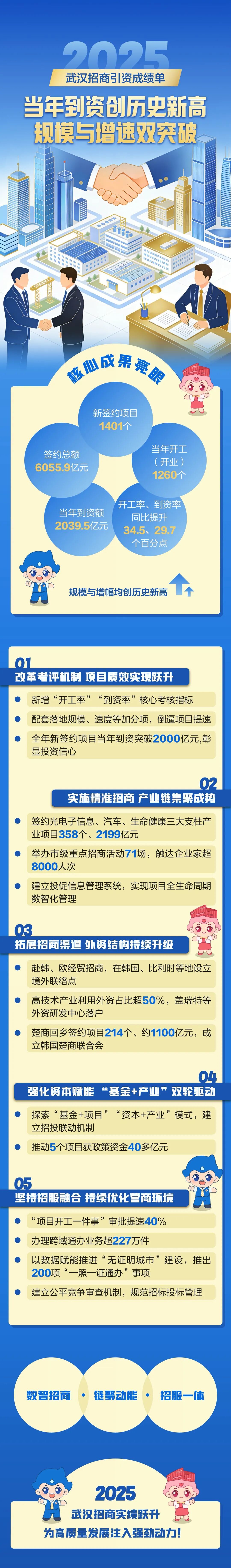 日迈月征,步履不停。2025年,武汉招商以硬核实力交出亮眼答卷:全年新签约项目1401个,签约总金额6055.9亿元。尤为亮眼的是,当年签约项目实际到位资金首次突破2000亿元大关,达2039.5亿元,创下历史新高,折射出强劲的市场潜力与投资活力。