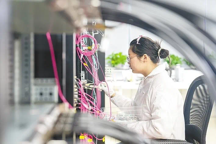 2月18日,武汉超擎数智科技有限公司实验室,工程师在测试服务器光模块。