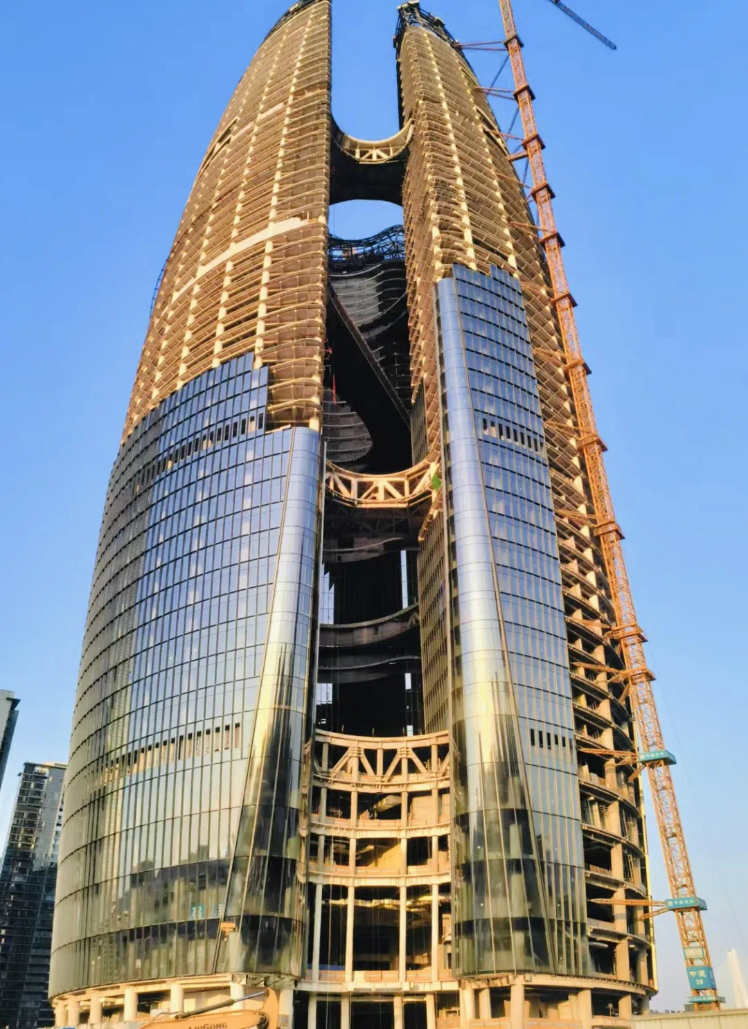 大楼承建方——中建三局总承包公司项目总工杨菊介绍,三座建筑的楼体向外偏心,需要由空中廊桥来保持结构稳定。三座廊桥为钢结构设计,最大连桥跨度65米、最大连桥重量600吨、最大连桥整体提升高度180米,吊装和焊接的要求极高。